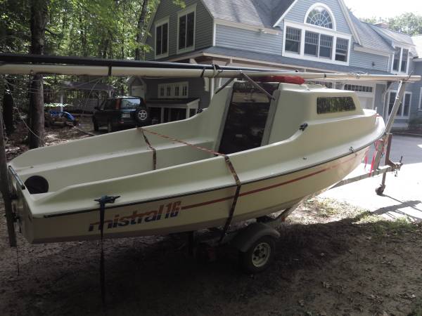 Someone in craigslist-nh has a Mistral 16'-cabin for the low price of $800....a fixer upper....that has two large sails and could use a 4hp x 20" outboard on the bracket....will look to see if the ad is still there.....believe it includes an old trailer.