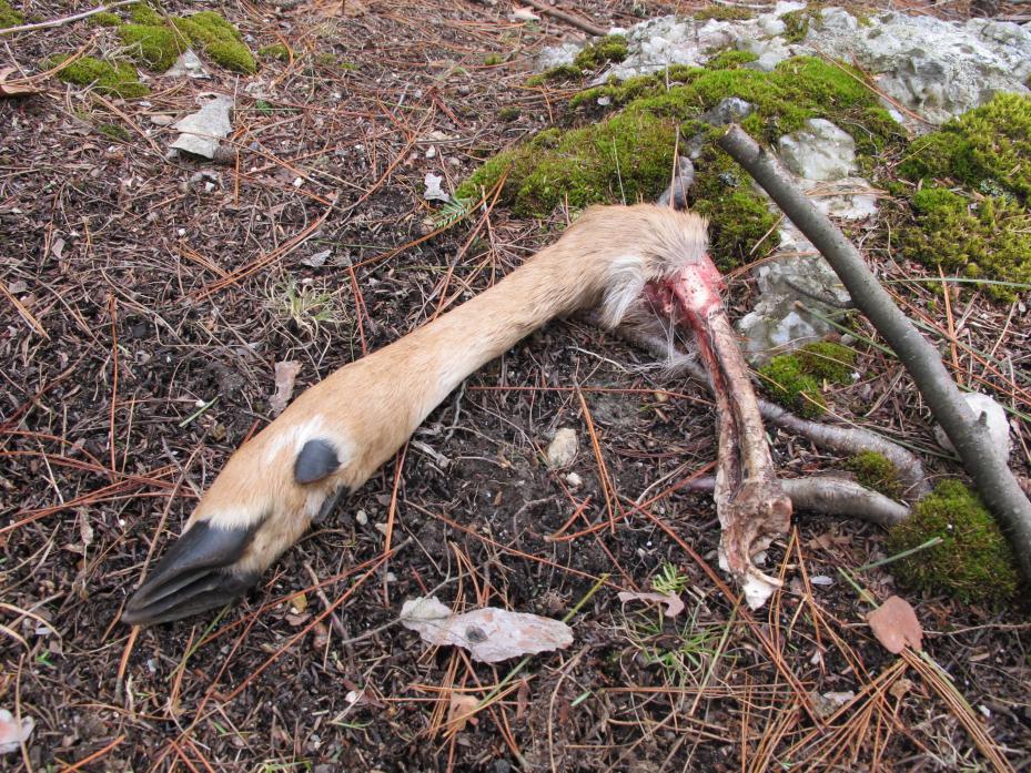 In July, the white bone was discovered by a guest's dog, who had chewed one end. From casual knowledge, it appears to be a fore- or rear-limb of a medium/large-sized critter. (Femur or humerus bone).