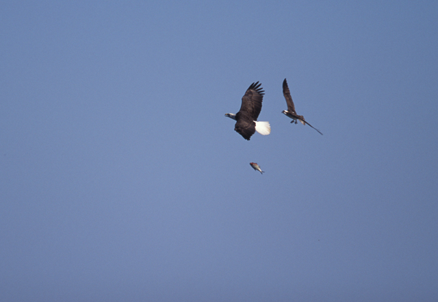 ![]() The following day, at 8-AM, an Eagle was flying with great determination over my boat in the Broads. ![]() ![]() Craning my neck, I saw an Osprey carrying a fish towards Mirror Lake, but over the treetops at Ayer's Point. He'd picked up some speed, but limited by his fish burden, the Eagle was quickly able to threaten him with his talons, and the Osprey released the fish. ![]() With apparent resignation, the Osprey slowly headed back the way he had come, which was Rattlesnake Island. The Eagle had seen the Osprey and had flown an intercept course—from the direction of Welch Island, two miles away. ![]() I watched all of this while trying—unsuccessfully—to open the freezer bag which "protected" my camera! ![]() But this "file photo" is of a typical Eagle-Osprey encounter: ![]() |