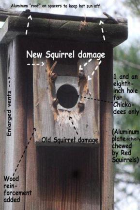 ![]() Those marks looks suspiciously like a Red Squirrel's been chewing on your house! When they have nothing else to do, they gnaw at tree limbs and cut down desirable saplings. ![]() Do those marks appear like a small pair of teeth were dragged across the surface? I was saving the below photograph for a discussion of Chickadee bird houses; however, the chewing at the bottom of the entry—especially—looks similar to your photo above. Since Red Squirrels have gnawed at the aluminum reinforcement plate—as indicated—I'm not sure I have a preventative for you; however, window screening is the one surface Red Squirrels haven't attempted entry to our cottage. |