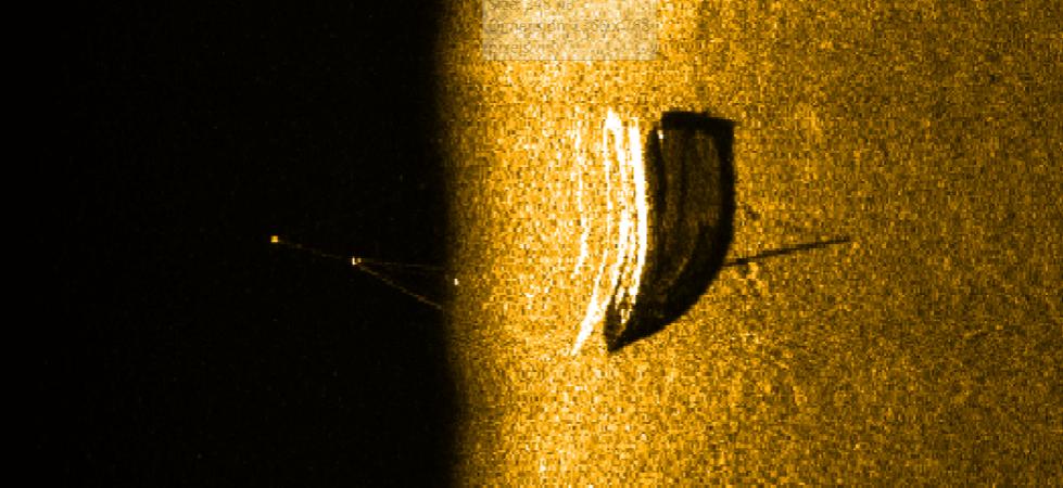 2013-9: A sailboat w/rigging up in the water column; Image likely suffering