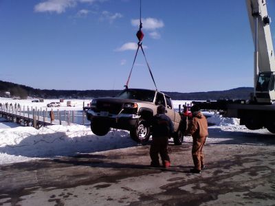 In the LACONIA DAILY SUN story in the link posted by mcdude above the truck sank further out and floated part way in toward the docks. The recovery effort brought it up to the docks to be lifted out.