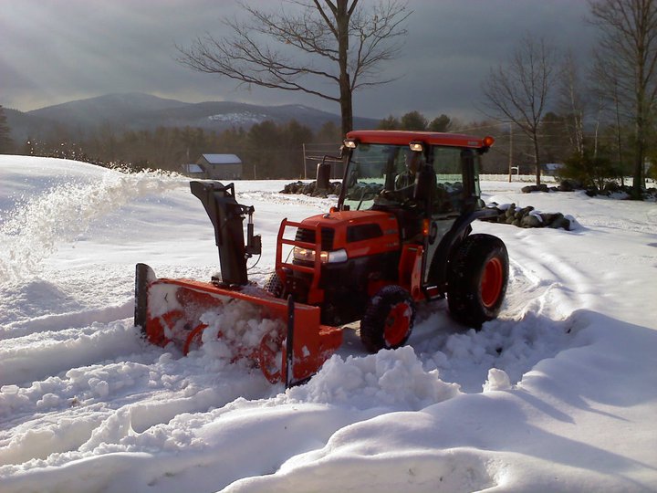 Biggd, As NH Solar noted, R4 tires are not great in the snow, or really much else IMO. I am running the smaller turf tires so it will fit into the Morton building's somewhat small door (just measured height of tractor at 82"). I have a loader with oversized New Holland bucket with quick release, 72" rear finish mower and 15KW generator. It is set up exactly as I wanted as it will likely be the last modern tractor I need to buy. Kubota makes a great tractor. I am in Moultonborough, you are welcome to check it out but the other tractor is way more fun to drive! |