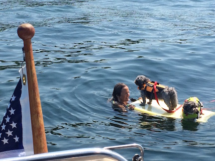 Sometimes people ask us about our sailing pups and what we do when they need to go. Well here you have it. The doggie water taxi to shore.