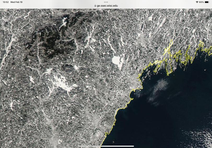 Today’s visible image from MODIS. First time in 6 years that Sebago has completely frozen.